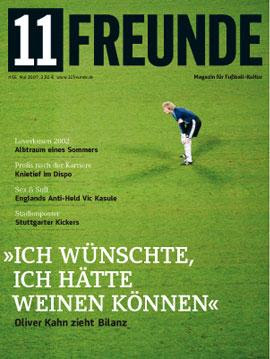 Die Mai-Ausgabe des deutsche Fußballmagazins "11 Freunde" beinhaltet neben einem unglaublich langweiligen und uninteressanten Interview mit Oliver Kahn eine schöne Geschichte über Bayer Leverkusen 2002, wie sie in sechs Wochen drei Endspiele verloren haben. Auch ohne Sympathie für sie kann man den unglaublichen Höhenflug und tiefen emotionalen Fall ziemlich gut nachvollziehen. Nach Meistertitel und Champions League 2005, einem Jahr 2006, das eines der furchtbarsten in meinem Fanleben war und einer Saison 2006/07, wo die Rapid erst in der letzten Runde vor der Winterpause - mit dem einzigen Auswärtssieg des Jahres 2006 - vom letzten Tabellenplatz weggekommen ist und nun drei Runden vor Schluß im harten Kampf um den UEFA-Cup steht sowie soeben die Austria paniert hat - bin ich irgendwie grad anfällig für solche emotionalen Hoch-und-Tief-Geschichten.