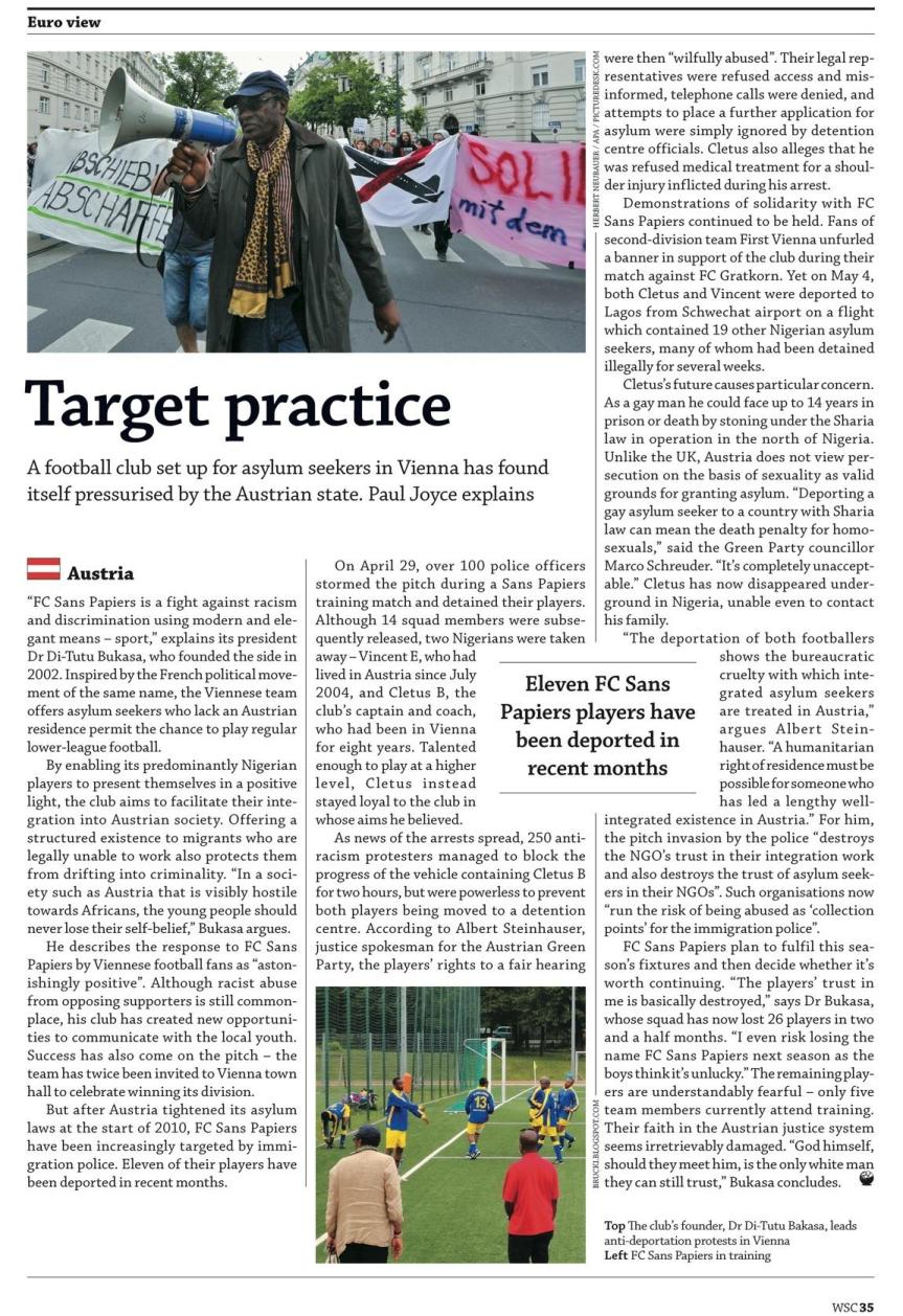 Über den Fall des Wiener FC Sans Papiers schreibt Paul Joyce. Der 2002 gegründete Fußballverein bietet vornehmlich afrikanischen Asylwerbern eine Perspektive. Traurige Berühmtheit erreichte er, als im April dutzende Polizisten überraschend eine Razzia bei einem Training abhielten und zwei Spieler in Schubhaft genommen wurden. Eine Demonstration versuchte später erfolglos ihre Abschiebung zu verhindern. Nun steht man vor dem Ende des Projekts, in das die Spieler das Vertrauen verloren haben, wie Vereinsgründer Di-Tutu Bukasa sagt. Eines der Bilder zur Illustration des Artikels durfte ich von