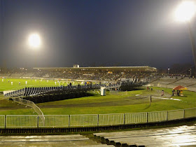 Das Všesportovní stadion wurde 1966 mit einer ursprünglichen Kapazität von 25.000 Plätzen eröffnet, heute sind es 17.000 bzw. 6.000, wenn man nur die Sitzschalen und nicht die Bänke nimmt, an denen der Zahn der Zeit bereits sichtlich genagt hat. Das runde (Fliegenpracker-)Design der 1974 installierten Flutlichtmasten habe ich erst unlängst auch im slowakischen Trenčín gesehen. Die Architektur des Stadions ist eine klassische Schüssel, wobei die beiden Längsseiten überdacht sind. Bemerkenswert die (Marathontor-?) Öffnung in der Mitte der Gegentribüne. Eine Stahlrohrtribüne in einer Kurve dient als Heimfansektor.