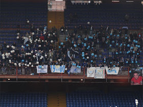 Die Choreographie auf Seiten Sampdorias galt dem zehnten Todestag des an einer Krankheit verstorbenen Simona Colombino von den Fedelissimi. Dazu wurden vor dem Stadion Schalhauben verkauft, der Erlös wird karitativ gespendet. Die Sampdoria-Kurve war voll, optisch schön anzusehen und gesanglich abwechslungsreich. Laut wurde es allerdings nie, das darf man sich aber ohnehin nicht mehr erwarten. Einen Torjubel hätte ich allerdings gern gesehen. Ein wenig skurril waren zehn überaus supportmotivierte Sampdoriafans auf der Nordtribüne. Im Auswärtssektor der Tesserati von Lazio gab es zu Beginn ein paar Luftballons zu sehen und dann manchmal Sprechchöre zu hören.
