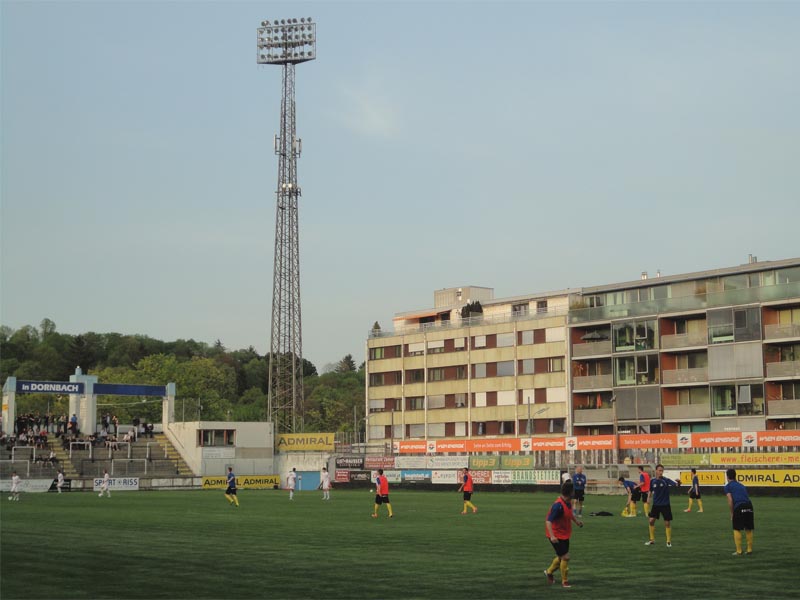 Auf beiden Längsseiten des Sportplatzes stehen Tribünen. Derzeit wird hier anscheinend ordentlich in Infrastruktur investiert, denn die Haupttribüne glänzt wie neu und die Vorbereitungsarbeiten für die Installierung eines Flutlichts sind zu sehen.