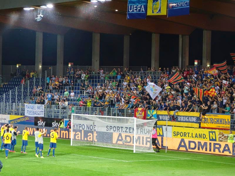 Die St. Pöltner Fankurve machte Stimmung. Für ungewohnte Töne sorgte eine Trommelgruppe abseits davon. Auf Seiten von Botev Plovdiv hatte sich angesichts der für sie hohen Kosten eine gute Zahl an Fans eingefunden. Organisierten Support gab es dort aber nicht.