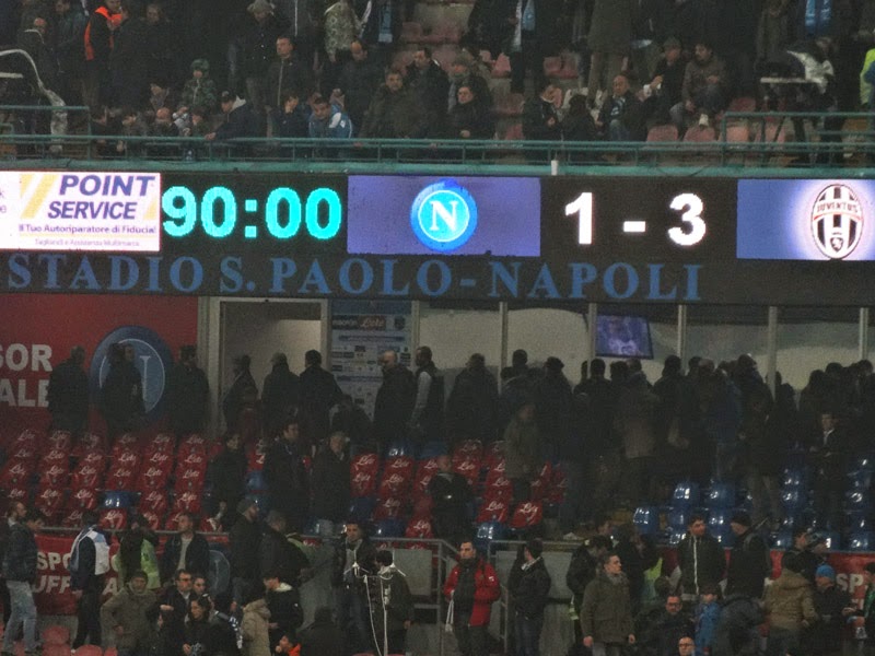 Nur kurze Freudenstürme ließ der Napoli-Ausgleich im Stadion ausbrechen. Fünf Minuten nach dem 1:1 stellte Juventus die Führung wieder her. In der ersten Hälfte hatte Juve mit einem Volley-Schuss getroffen. Versuche Napolis, in der Schlussphase noch einen Elfmeter zu bekommen, waren nicht von Erfolg gekrönt. Nachdem Napoli Chancen vergeben hatte, setzten die Gäste mit einem Kontertor den Endpunkt des Spiels. Giorgio Chiellini erhielt in der zweiten Hälfte zur Verschönerung seines Haupts einen Turban.