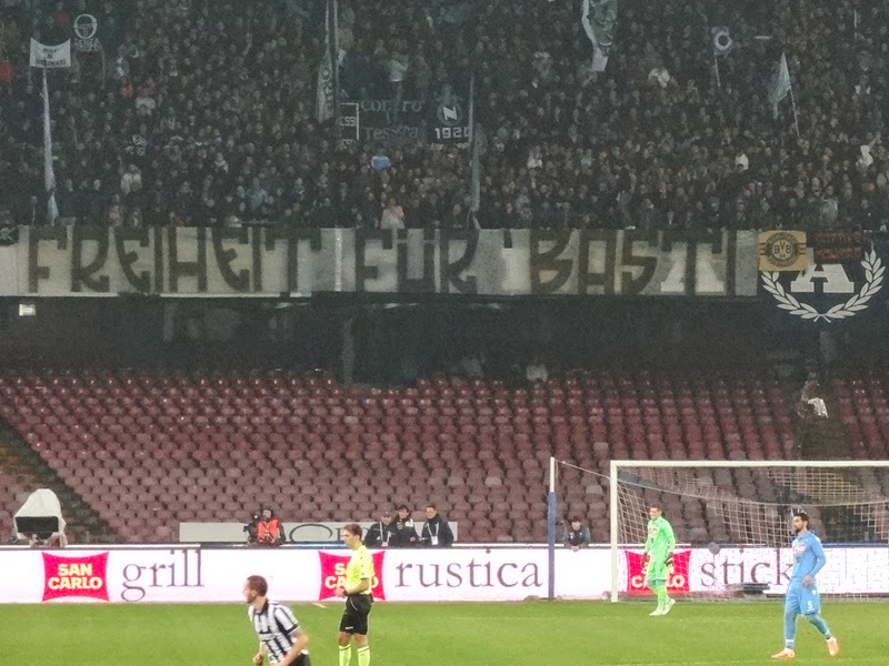 Die Choreo der Curva A zu Matchbeginn thematisierte mit Spruchband zum bengalenumrankten Dressenabzeichen des italienischen Cupsiegers den Supercup, den Cupsieger Napoli Ende Dezember am verrückten Austragungsort in Katar gegen Meister Juventus gewonnen hatte: „Doha non appartiene a noi, gente con valori ... un applauso solo agli 11 leoni“ („Doha gehört nicht zu uns, die wir Leute mit Werten sind ... Applaus nur für die 11 Löwen“). Vor der Curva B hing das ganze Match über ein Spruchband, das mit den Worten „Re Cecconi c’è“ auf den Tod des Lazio-Spieler Luciano Re Cecconi anspielte. Re Cecconi war am 18. Jänner 1977 von einem Juwelier erschossen worden, als er mit zwei Freunden dessen Geschäft betrat und dabei als dummen Scherz „Das ist ein Überfall!“ gerufen hatte. Am 18. Jänner 2015 wird Napoli bei Lazio in Rom spielen.