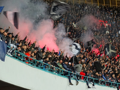 Bereits eine gute dreiviertel Stunde vor Spielbeginn war das Stadion gefüllt und die Atmosphäre freudig gespannt. Während vor dem Match und in dessen ersten Minuten der Support von den Rängen eine gute Stimmung zauberte, ließ dies mit Fortdauer des Spiels stark nach. Erst der kurzzeitige Ausgleich befeuerte wieder das Stadion für kurze Zeit etwas. Der Gesang „e chi non salta / è juventino / oh oh oh oh oh oh oh oh ohohoh“ zur ja sehr schönen Melodie von Bella ciao war recht nett. Aus der Curva A flogen mehrmals Bengalen in den leeren Sektor unter ihnen hinab, aus der Curva B dann nach Schlusspfiff zum Abgang der Gäste auch eine Fackel auf die Laufbahn. Auswärtsfans war der Besuch verboten worden.