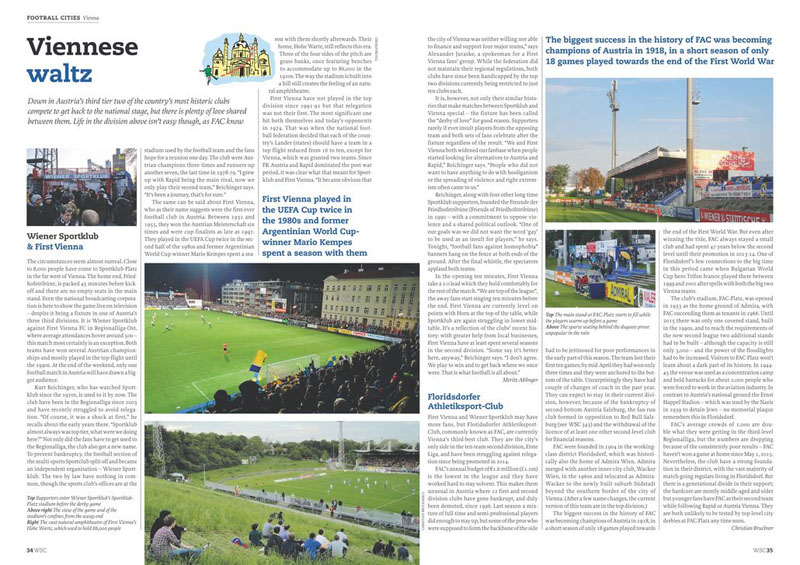 Eine große Ehre wurde meiner Wenigkeit diesmal zuteil. In der Reihe Football Cities wirft When Saturday Comes regelmäßig einen Blick auf kleinere Vereine in für ihre großen Klubs bekannten Fußballstädten. Diesmal ist das schöne Wien dran. Ballesterer-Kollege Moritz Ablinger schreibt über Wiener Sportklub und Vienna, ich selbst portraitiere den FAC als derzeit sportlich drittstärkste („stärkste“) Kraft in Wien. Die Bebilderung der beiden Artikel stammt ebenfalls von mir.