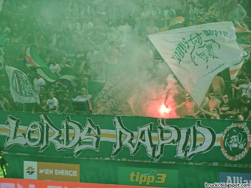 Die Atmosphäre im Stadion war, wie zu erwarten war, nocheinmal einen Schritt besser und dichter als vorige Woche. Schließlich ging es diesmal um etwas. Da der 18-jährige Rapid-Neuzugang Entrup Austria-Ultra der lila Ultragruppe „Inferno“ gewesen war, wurde ihm vom Block West Ablehnung entgegengebracht. Im Auswärtssektor begingen die Rieder Supras ihr zwanzigjähriges Jubiläum.