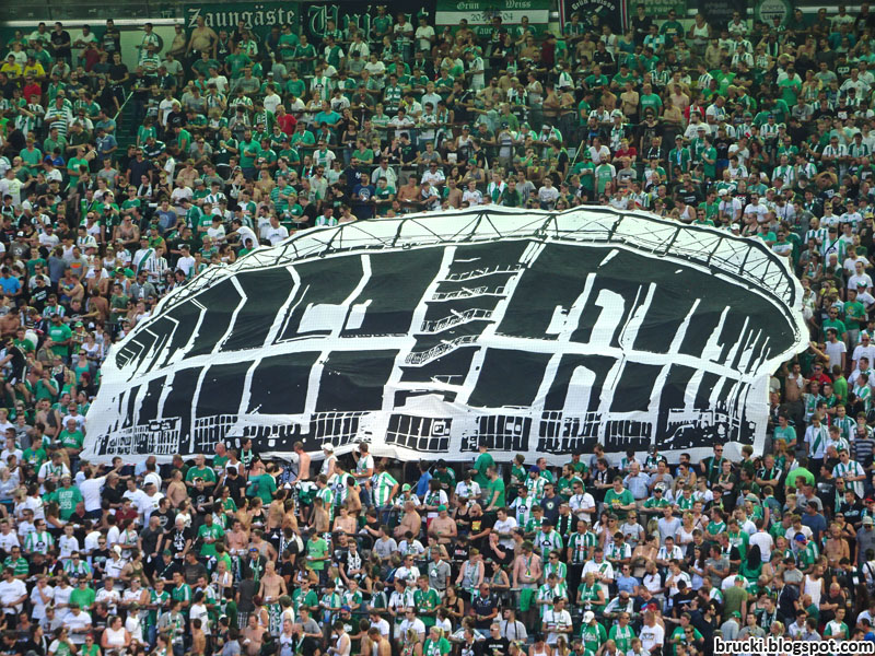 Eine große Show bot der Block West mit der Choreographie der Ultras vor Spielbeginn. Die Thematik der Rückkehr vom Praterstadion nach Hütteldorf wurde mit großen Abbildern der Stadien und einer Straßenbahnfahrt einer Bim-Garnitur von einer Haltestelle Prater zu einer Haltestelle Hütteldorf dargestellt. Die Ankunft wurde mit grün-weißem Konfettiregen gefeiert. Die alte Rapidhymne der fünfziger Jahre, „Rapid bin ich und will es sein“, versucht der Verein seit dem Einzug in das neue Weststadion kurz vor Anpiff im Stadion gemeinsam singen zu lassen, was einmal mehr und einmal weniger gut gelingt. Als diesmal der Block West dieses Lied während des Spiels im Support sang, kam das schon stärker rüber.