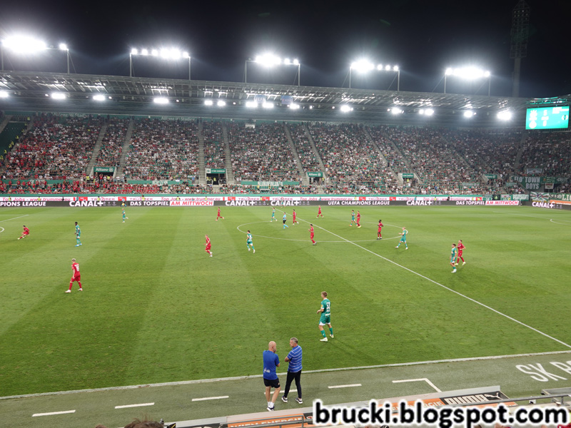 Im Block West zeigten die Tornados einen großen Rapid-Schriftzug zu Spielbeginn mit Erinnerung an das 125-jährige Vereinsjubiläumsjahr und die blau-roten Gründungsfarben. Feine, laute und sehr gute Europacupstimmung mit einigen Höhepunkten. Mit „Die Austria Wien ist so im Oasch.“ oder „Seht ihr Veilchen, so wird es gemacht.“ gab es nebenbei auch Grüße zu den Unnötigen, denen der seltsame Bundesliga-Meisterschaftsmodus als einer der schlechteren Mannschaften der Tabelle einen Europacupstartplatz gegeben hat, wo diese im ersten Antreten ausschieden. Dieser Europacupabend machte Spaß und Lust auf mehr.
