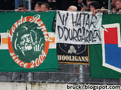 Mit 2.300 Leuten füllten die Gäste den Auswärtssektor und zeigten höhnisch Always look on the bride side of life singend ein Spruchband in Umkehrung des Choreographie-Spruchbands vor einer Woche, das ihnen Hammarby beim Derbysieg am Sonntag ebenso singend präsentiert hatte.